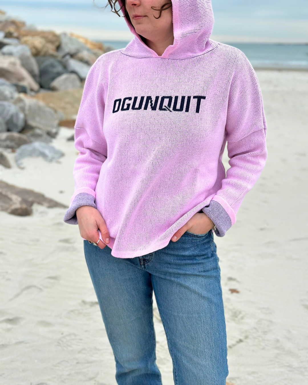 Show off your Ogunquit love in the Binghamton Knitting Co. Hooded Boxy Sweater. Crafted in a breathable cotton-blend knit, this hoodie features bold contrast lettering and a relaxed, boxy crop fit for all-day comfort. Its oversized silhouette makes it easy to style year-round — whether you’re layering on cool summer nights or keeping cozy through fall and winter. Available in two fun colorways (light pink with navy lettering or navy with pink lettering), it’s the perfect piece for yourself or a gift to share with family and friends.