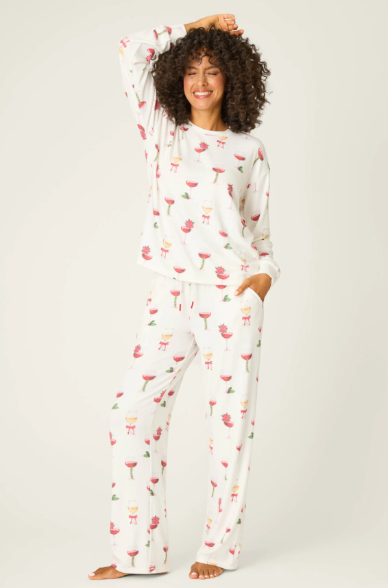 Raise a toast to cozy season in the Let’s Get Toasty Wine Print PJ Set. This ivory two-piece pajama set is sprinkled with festive champagne glasses and made from PJ Salvage’s signature peachy jersey—soft, stretchy, and unbelievably comfy. The crewneck long sleeve top pairs with relaxed straight-leg pants featuring a drawstring waist for the perfect custom fit. A holiday favorite for movie nights, slow mornings, and every sparkling moment in between.