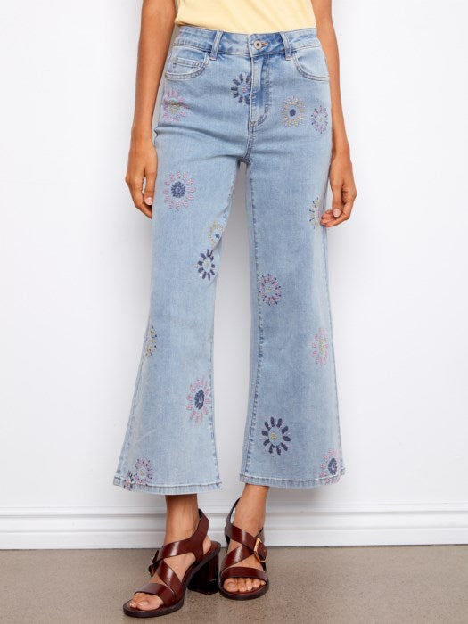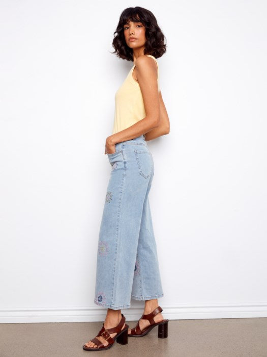 Wide Leg Jeans with Flower Embroidery