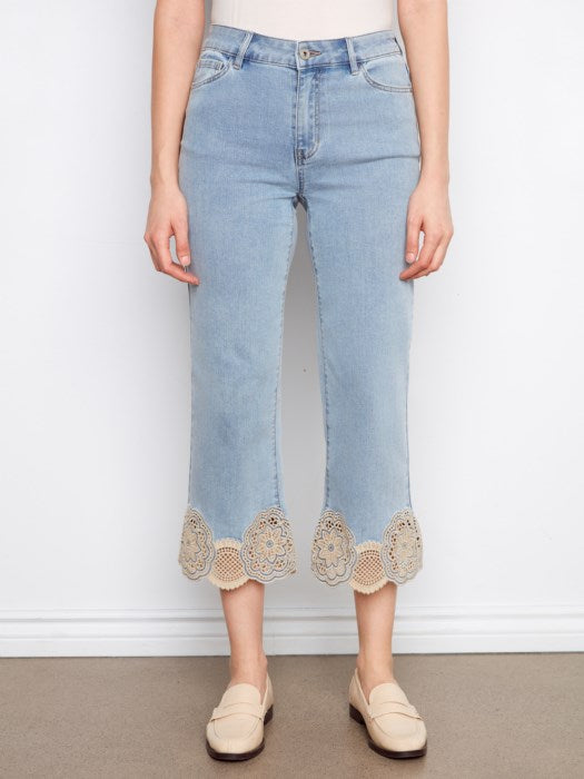 The delicate laser-cut floral lace hem adds a feminine, eye-catching finish that elevates this easy silhouette. With a classic 5-pocket design and comfortable stretch, they move with you while maintaining their shape — making them a go-to piece for spring and beyond.