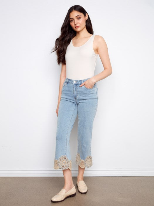 A fresh twist on a denim classic, the Charlie B Cropped Flare Jeans with Lace Hem combine everyday comfort with standout detail. Designed in soft stretch denim, these flared jeans offer a flattering regular rise and cropped length that’s perfect for showing off sandals, sneakers, or a little heel.