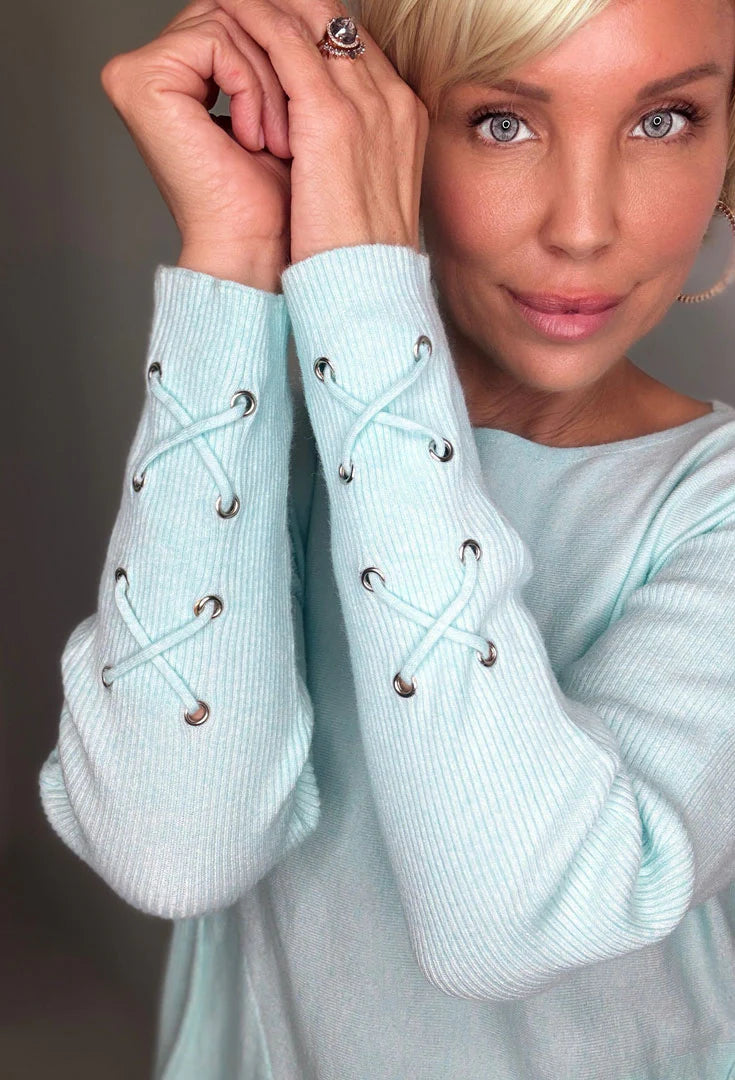 Designed with a slightly longer body and flattering neckline, it effortlessly pairs with jeans, leggings, or skirts. The standout crochet-tied sleeves add a touch of playful charm, while convenient side pockets blend functionality with effortless style. Perfect for layering or wearing on its own, this sweater is an easy go-to for casual or polished looks.