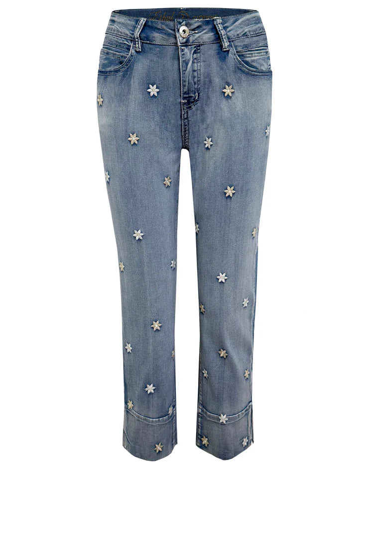 They feature playful crystal flower embellishments that add a feminine, standout detail to a classic cropped denim silhouette.