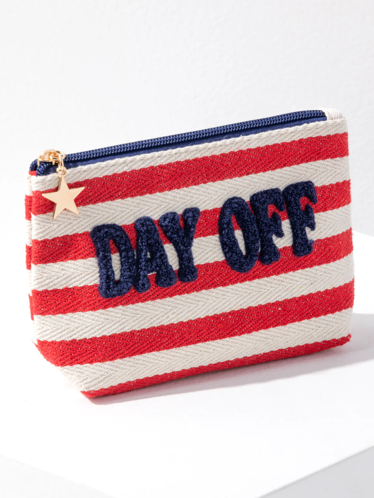 Celebrate your well-earned downtime in style with the Morgan “Day Off” Small Zip Pouch—a vibrant, patriotic-inspired accessory designed for quick getaways, summer adventures, and everyday organization. Featuring bold red and white stripes paired with navy “DAY OFF” lettering, this pouch brings a playful, all-American feel to your essentials.