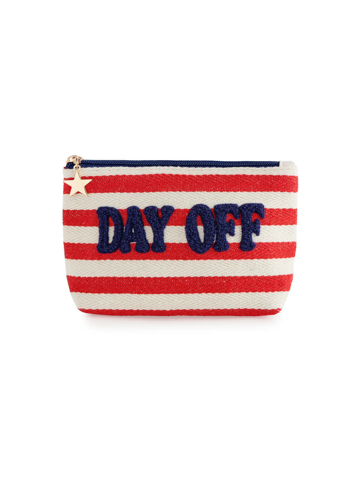 Its bold patriotic stripes, “DAY OFF” lettering, and gold star zipper charm make it a standout summer accessory.