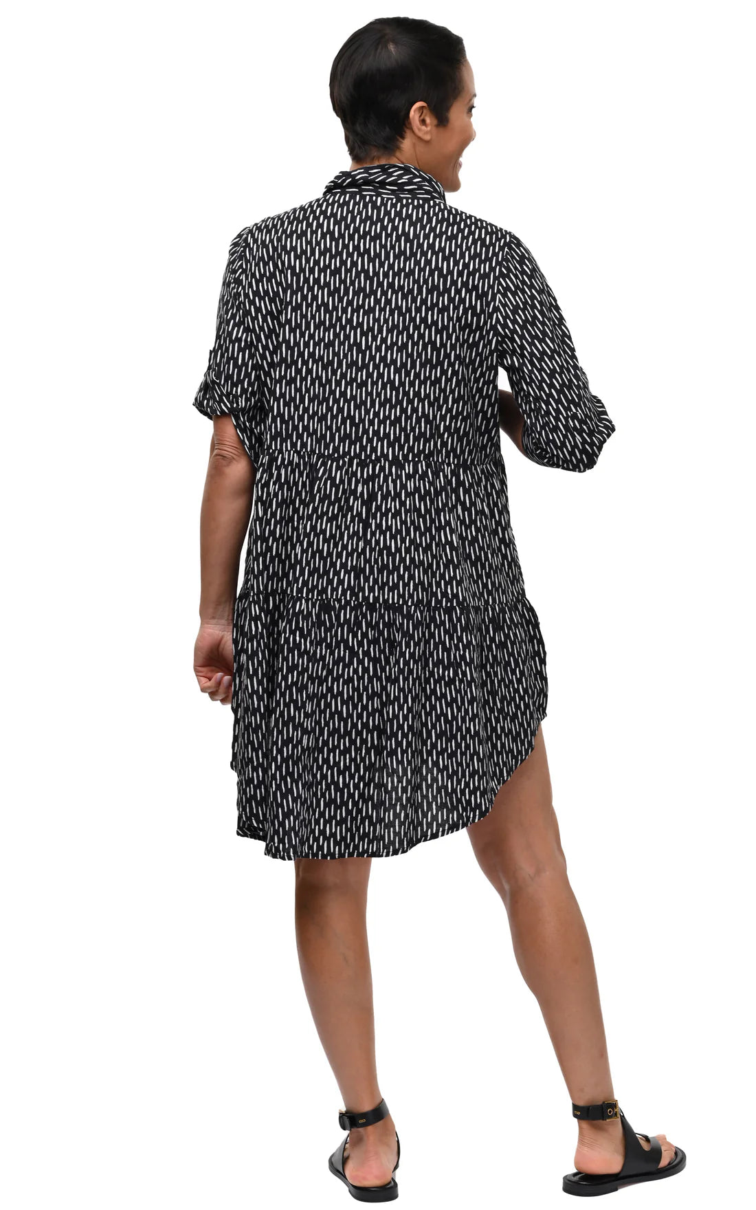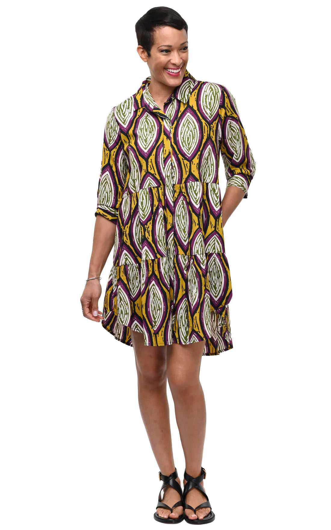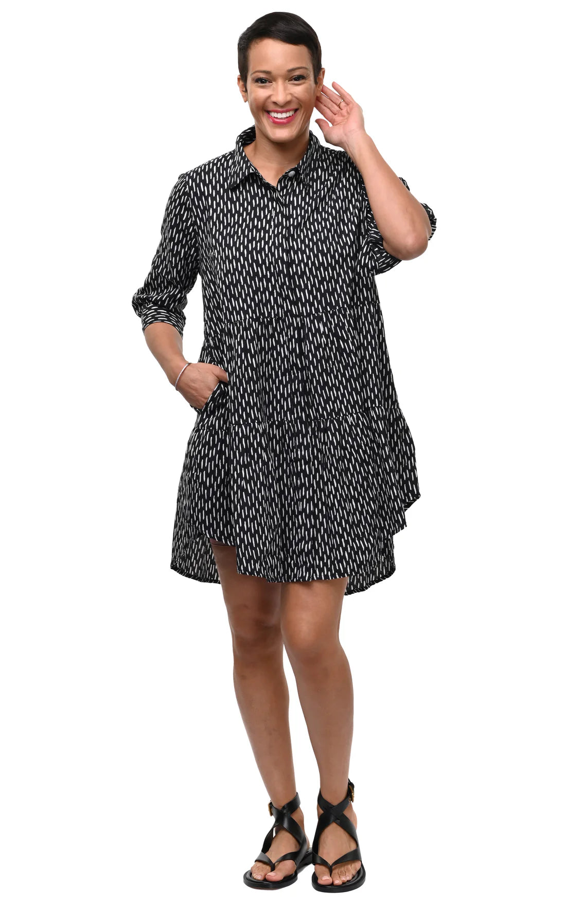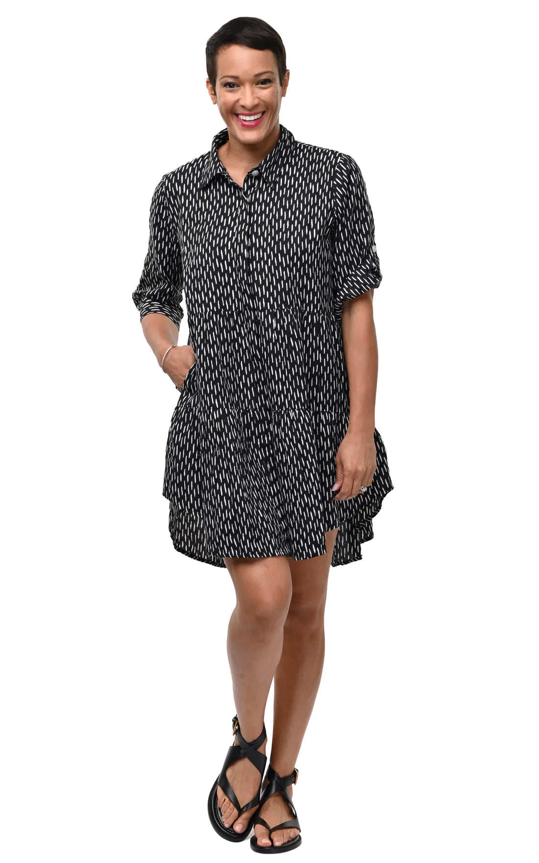 Featuring a button-front placket, tiered design, and side seam pockets, it’s both functional and feminine. The relaxed fit allows for easy movement while maintaining a flattering silhouette, making it perfect for spring, summer, or layered with a sweater in cooler months.
